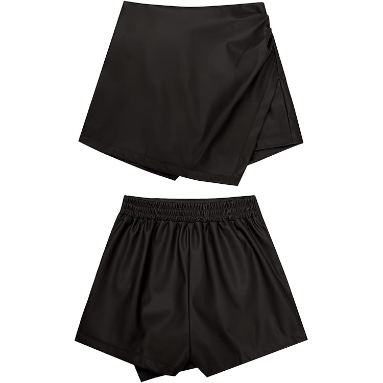 Shorts for Women Faux Leather Skorts High Waisted PU Leather Shorts Elastic Waist Ruched Wrap Skorts Skirts
